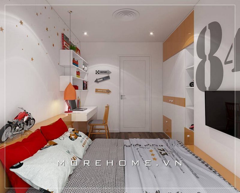 Nội thất phòng ngủ bé trai hiện đại với gam màu trắng tinh tế làm chủ đạo, kết hợp với một số chi tiết màu vàng nổi bật góp phần tạo nên sự cuốn hút cho không gian.